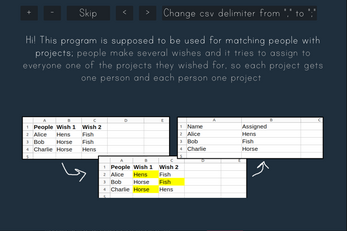 You need a .csv file as input (it's a common spreadsheet save/export format) and it'll make a new .csv file as output, pairing projects to people.
